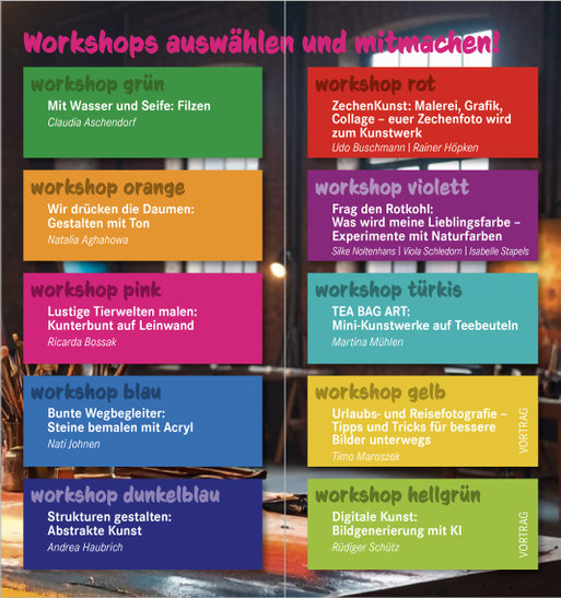 Bei strahlendem Herbstwetter konnten wir am 7.09. mit euch eine bunte, kreative und fröhliche Zeit in der Zechenwerkstatt in Dinslaken-Lohberg verbringen. Viele Kunstwerke sind dabei entstanden und sicherlich wurden einige Ideen umgesetzt, die sonst nur im Kopf geblieben wären!